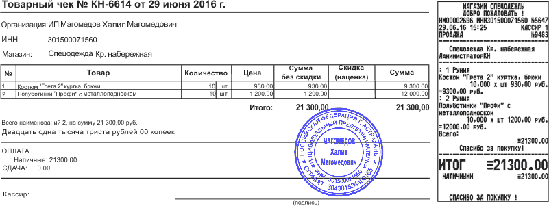 -название юридического лица или фамилия, имя и отчество предпринимателя. Не стоит забывать прописывать и правовую форму бизнеса. Тем более дополнение товарного чека реквизитами не запрещено;